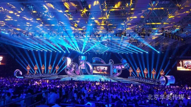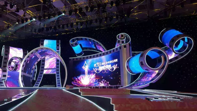 舞臺中央“膠片花”的輪廓采用鋁塑板,中間是曲面彩幕,整個舞臺的大背景是星光黑幕,寓意這是一個繁星璀璨的夜晚。