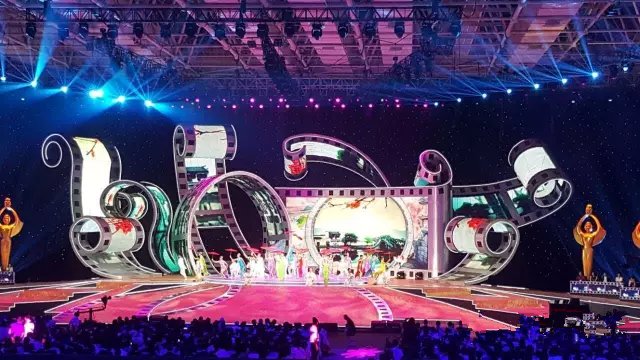 梁溪清先生將膠片、片夾等電影元素歸納、放大、典型化,把舞臺中央用膠片造型成花的具象;舞臺地面打破常規(guī),根據(jù)電影膠片的概念,量身定制,呈現(xiàn)異形、不規(guī)則、膠片的形狀。舞臺地面膠片就是一條電影之路,象征著中國電影的發(fā)展之路。本屆典禮的舞美視覺呈現(xiàn)被評為史上最具創(chuàng)意的晚會之一。