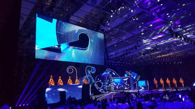 舞美呈現(xiàn)追求“金屬感”,金屬的元素即金和銀,“金”代表獎項的含金量,“銀”由膠片、片夾營造,中央LED大屏幕巧妙融合到異形舞臺中