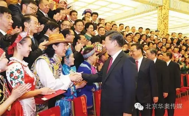 演出開(kāi)始前,習(xí)近平等黨和國(guó)家領(lǐng)導(dǎo)人會(huì)見(jiàn)了各民族演職人員代表,同他們親切握手并合影留念。